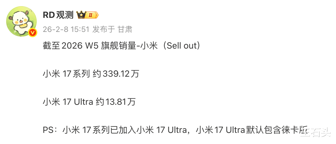 那真实情况如何呢?根据第三方最新公布的数据,截至2026年第五周,小米17系列在国内的销量已接近340万台,其中小米17 Ultra大约是13.8万台。