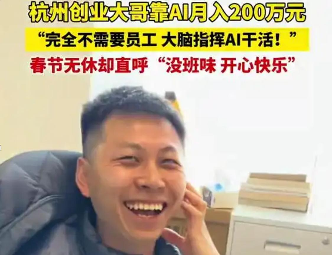 97年的年轻人,父亲是某大厂的高管,这个年轻人自己开了一家一人公司,没有员工,每天就对着电脑用AI干活,做的是海外AI+营销的赛道,月收入据说高达200万,运营成本只有几千块钱的AI工具订阅费。