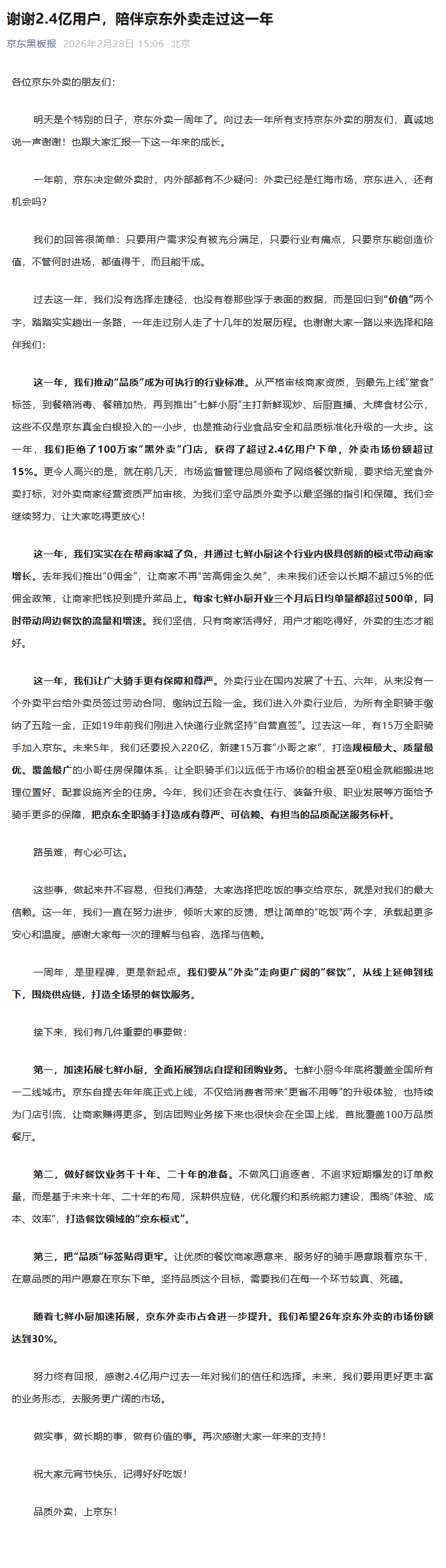 IT之家2月28日消息,明天将迎来京东外卖一周年,京东黑板报今日发文回顾了过去一年京东外卖的成长,并对新一年进行了展望。