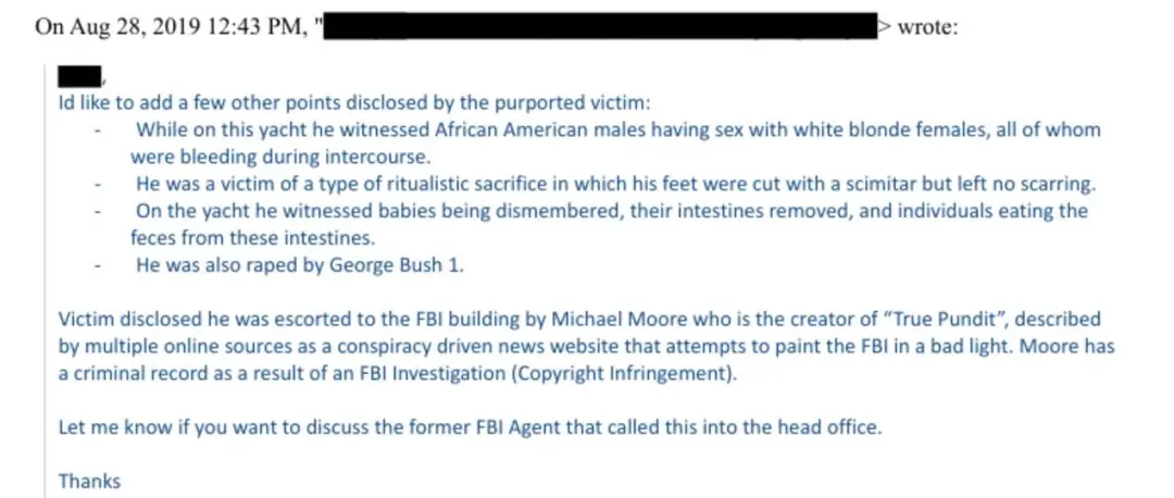 说到这里,首先得叠个甲。就像一开始说的,这份文件虽然存在,但是真实性确实存疑。FBI在文件最后也备注,说提供这份证词的受害人,明显存在精神问题,而且因为“登船”的时候年龄太小,所以很早就接受过重度药物诱导,从2016年就在接受治疗。
