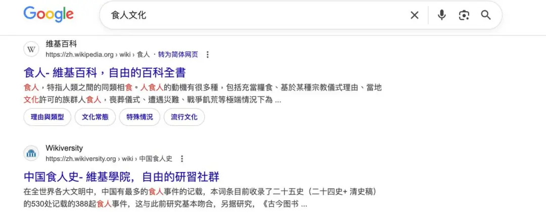 更有甚者,如果咱们打开谷歌这类国外的搜索引擎,用简体中文去搜索“食人文化”,跳出来的前排搜索结果会告诉你,中国人是历史上“人食人”时间记录最多的民族。