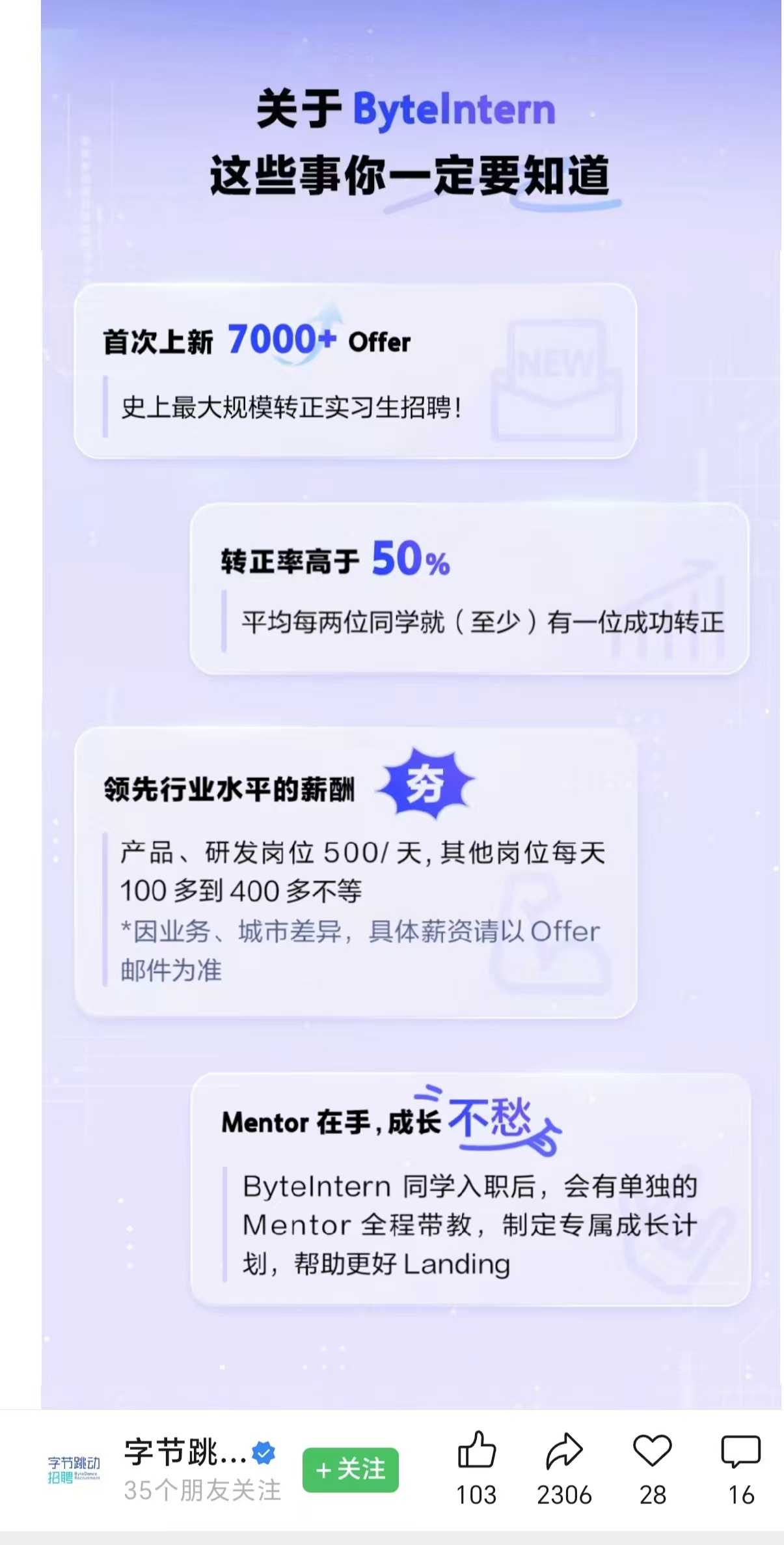 除了腾讯,字节跳动3月6日也在官方公众号发布消息称,正式启动2026年实习生招聘,首次提供7000+offer,招聘对象为2026年9月至2027年8月期间毕业的2027届毕业生。据称,此次是其史上最大规模转正实习生招聘,转正率高于50%。招聘岗位包括研发、产品、运营、设计、职能/支持、销售、市场、游戏策划。