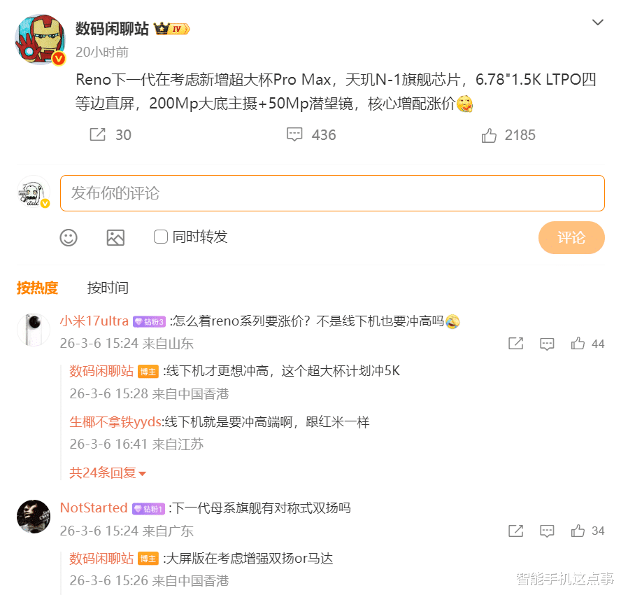 另一边是下一代Reno被爆要加一个“Pro Max”的超大杯,核心增配,听起来也要涨价,用户需要考虑好自身的预算。