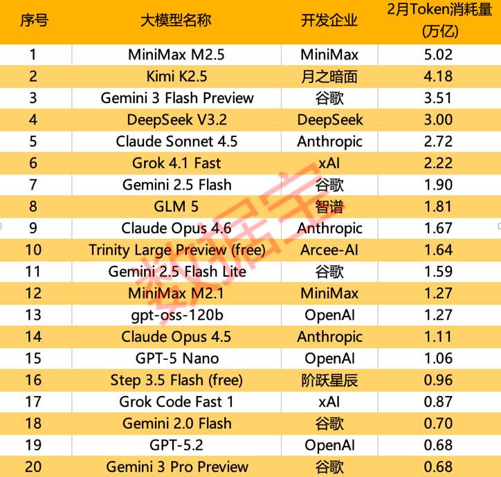 来自全球最大AI模型API聚合平台OpenRouter的数据显示,截至2026年2月28日,前十模型总Token消耗量已突破28.7万亿,其中中国模型贡献超过14.69万亿,单月Token调用占比首次过半。