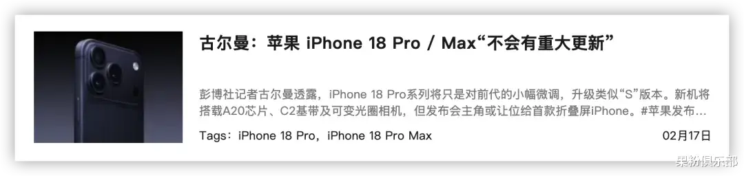也就是说,iPhone 18 Pro 系列将只是对去年 iPhone 17 Pro 和 17 Pro Max 的小幅微调。