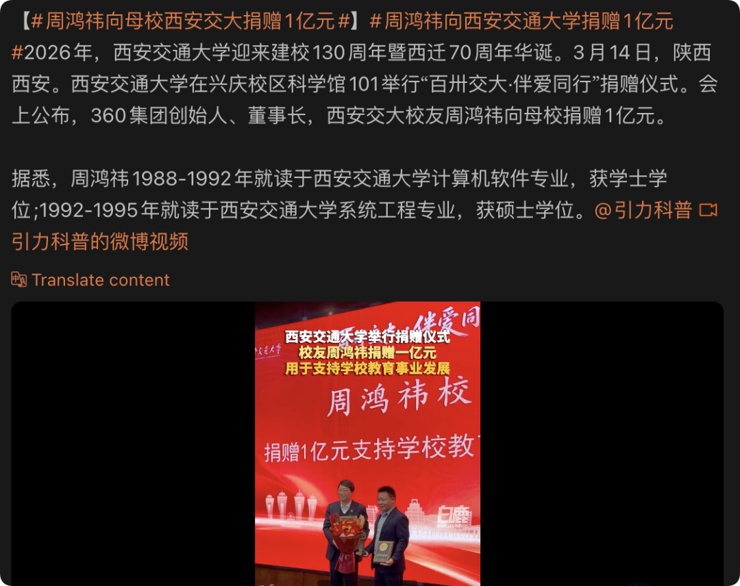 3月14日,西安交通大学在兴庆校区科学馆101举行“百卅交大·伴爱同行”捐赠仪式。会上公布,360集团创始人、董事长,西安交大校友周鸿祎向母校捐赠1亿元。