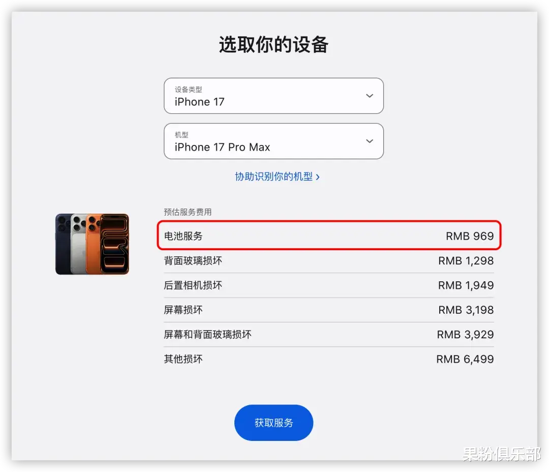 如果未购买 AppleCare+,iPhone 17 Pro Max 的电池更换价格高达 969 元。