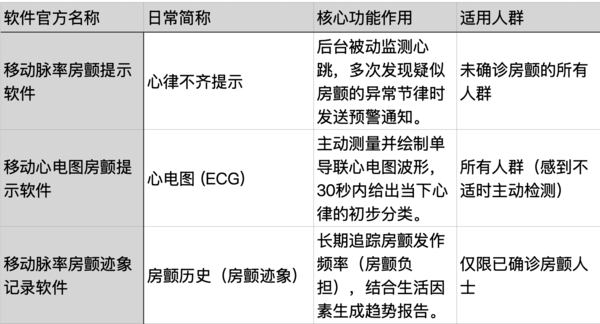 简单总结一下来看,目前关于心脏健康,AppleWatch一共带来了三个软件,满足不同用户。为了让大家更直观地理解AppleWatch在心血管领域的这几项核心功能,我们可以通过下面这个表格,清晰地看出它们的具体作用和适用边界: