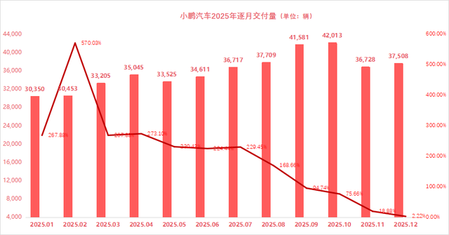 2025年小鹏汽车全年车辆交付429,445辆,较2024年的190,068辆同比增长125.9%。尽管前三季度呈逐季上升趋势,但在四季度增速却大幅放缓。至12月,同比增幅仅2.2%。海外市场,全年海外销量接近翻倍至4.5万辆,海外收入占比超过15%。
