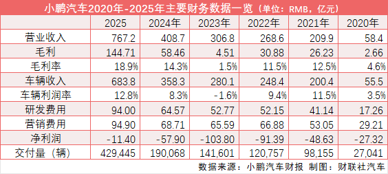 财报显示,2025年小鹏汽车实现营业收入767.2亿元,较2024年的408.7亿元同比增长87.7%。分季度来看,全年营收呈现逐季稳步攀升态势,季度环比增长率维持在9%-16%区间。