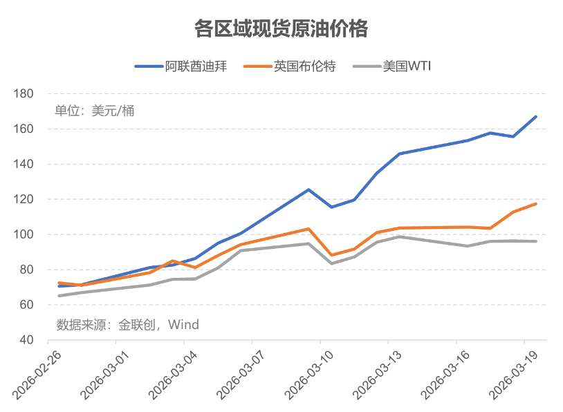 由于冲突导致霍尔木兹海峡运输停摆、贸易量锐减,中东原油基准价格升至历史新高,成为全球最的原油。3月19日,迪拜原油现货价格已达166.97美元/桶,相比布伦特原油的溢价已接近50美元/桶。