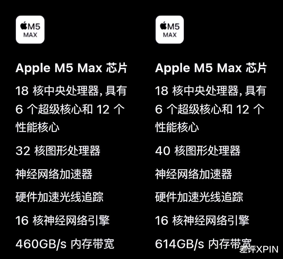 这颗 M5 Max 芯片,可不是 M5 的简单升级。核心架构对比 M5,彻底放弃了 E核,转而使用超级核心 + 性能核心的全大核设计,CPU 规模更是来到了 6 + 12 共 18 核心。