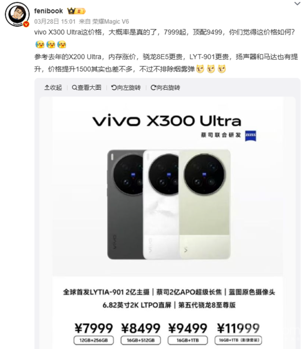 [CNMO科技消息]3月30日,数码博主“智慧芯片案内人”发文称:“Ultra手机的成本和价格上涨是个问题。已经有厂商调整策略了。今晚先看看vivo是如何应对这一调整”。据CNMO了解,vivo将于今晚19:00举办vivoX系列春季新品发布会,届时将推出X300Ultra和X300s两款机型。