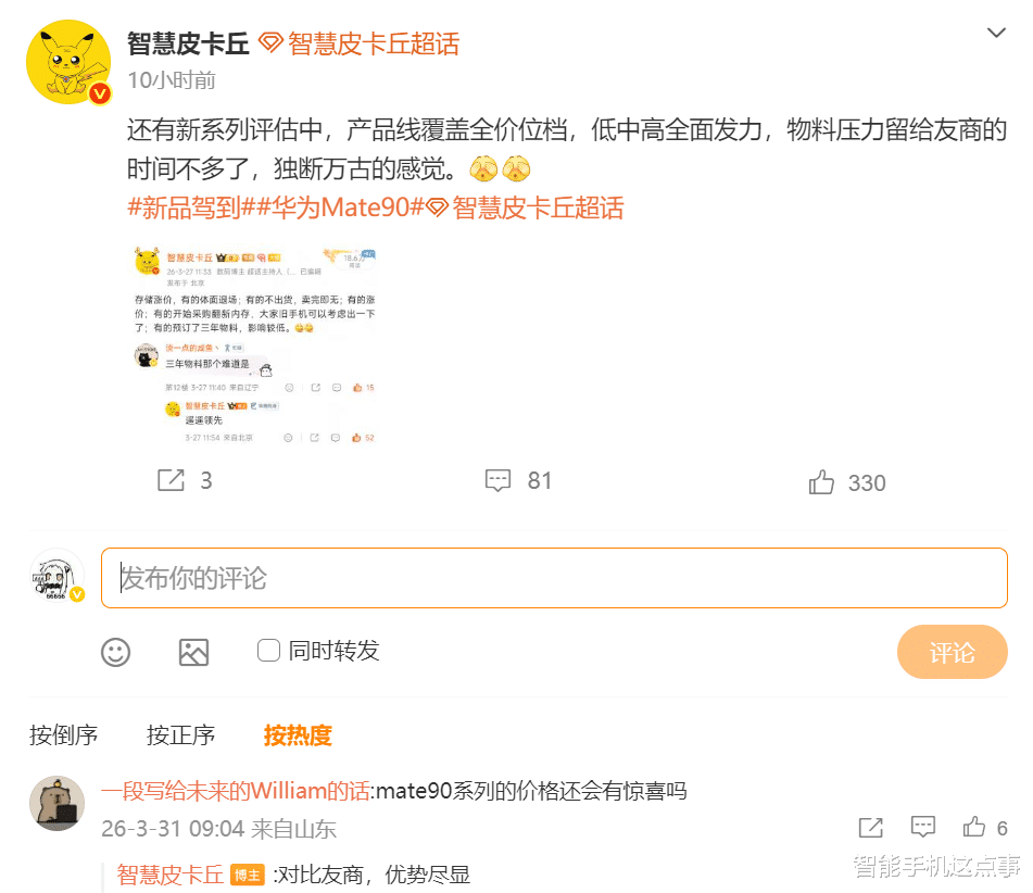 而近期更是有博主透露华为正在评估全新的Mate90系列机型,进一步拓展产品线矩阵,甚至表示华为产品线覆盖全价位档,低中高全面发力,物料压力留给友商的时间不多了。