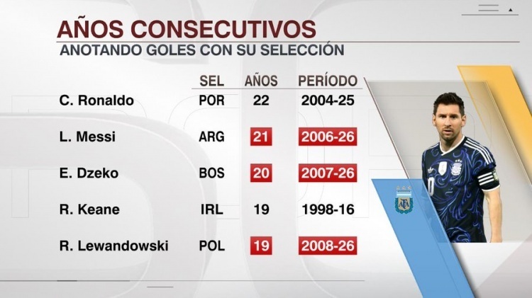 据统计,梅西已经连续21年代表国家队破门,他也超越了波黑中锋哲科的连续20年,排在第2位,仅次于C罗(22年),这也是梅西生涯第902球。