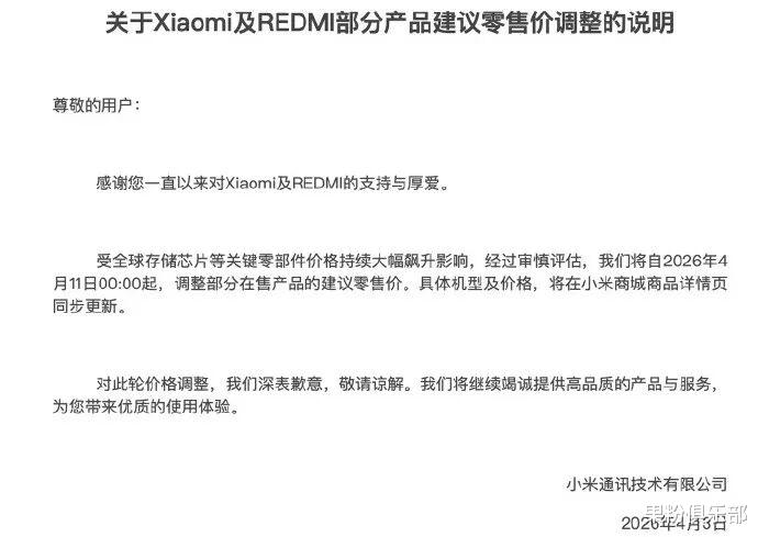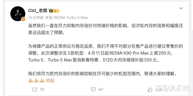 自 4 月 11 日起,REDMI K90 Pro Max 建议零售价上调 200 元。
