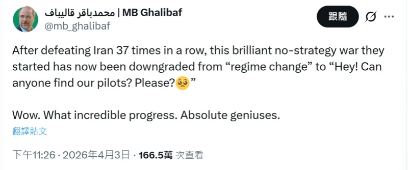 “在(宣称)连续37次击败伊朗之后,他们(美国和以色列)发起的这场自视高明却毫无策略的战争,如今已经从‘政权更迭’降级成‘嘿!有谁能找到我们的飞行员吗?拜托’。多么惊人的进步!简直是天才!”卡利巴夫写道。