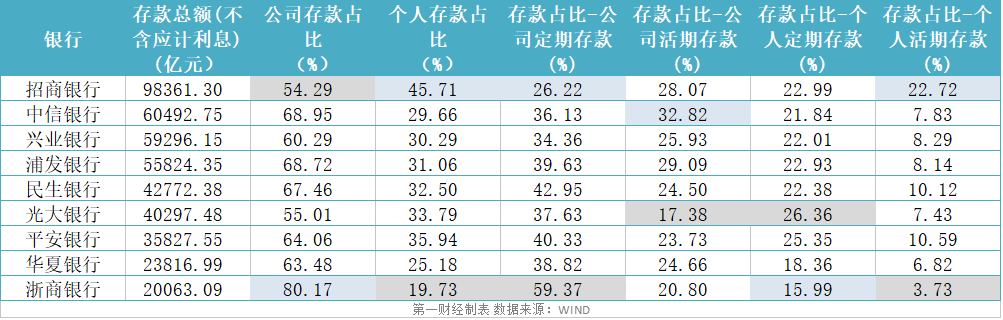 从具体定价来看,多数银行对公存款平均成本率低于个人存款平均成本率。去年末数据显示,浙商银行公司存款占比超过80%,中信银行、浦发银行、民生银行对公存款占比也接近7成,但由于它们的定期占比普遍更高,在一定程度上削弱了成本优势。