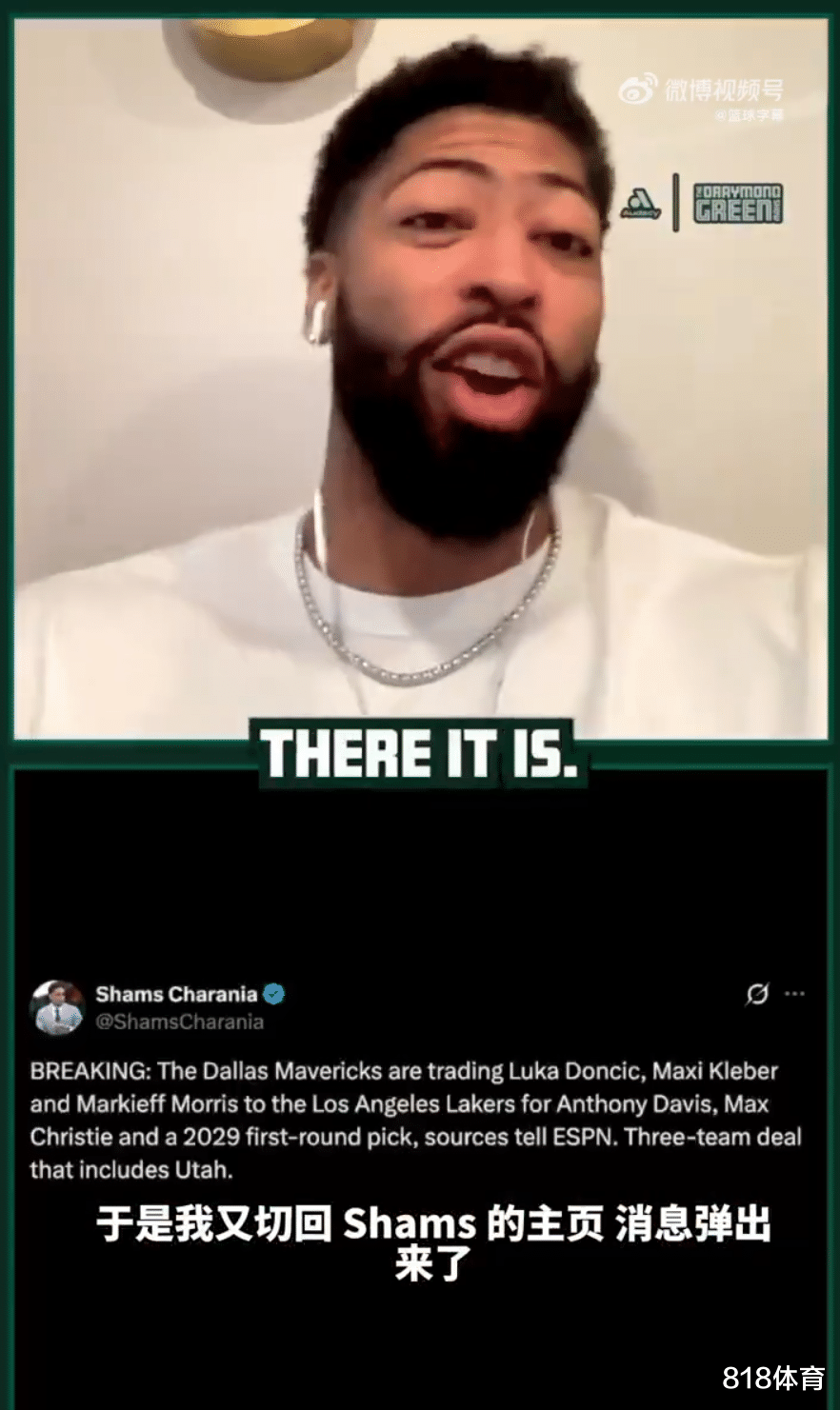 “于是,我又切换到了Shams的主页,结果消息弹出来了,东契奇加盟湖人,浓眉被交易去独行侠。”