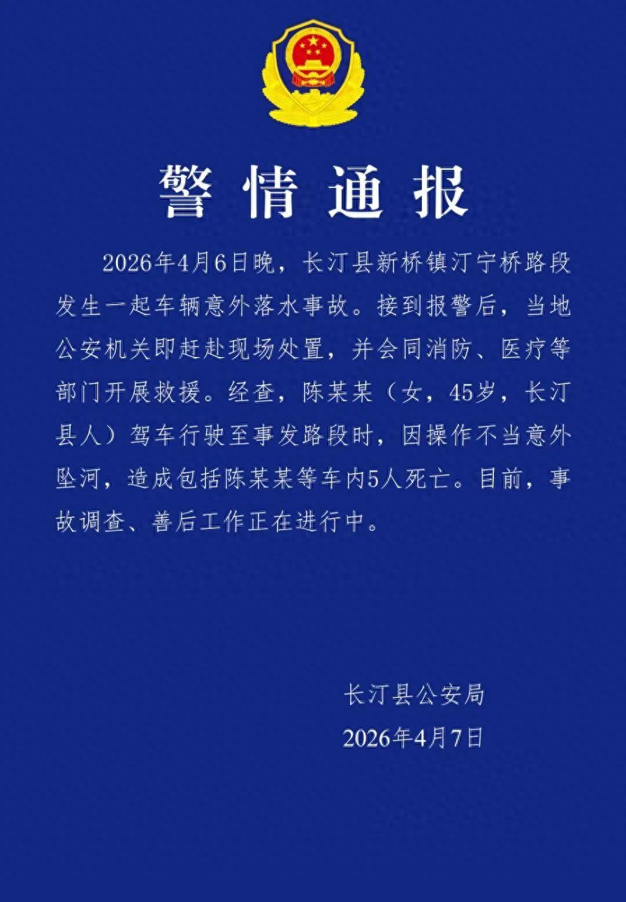 4月7日,福建长汀公安发布警情通报:2026年4月6日晚,长汀县新桥镇汀宁桥路段发生一起车辆意外落水事故。