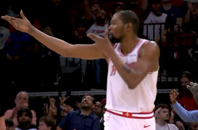 第二节火箭继续压制76人并且单节38-30又赢8分,半场打完火箭73-56领先到17分;次节杜兰特火力全开,金鸡独立抛投命中,原地旋转直接干拔得分,急停中投更是稳准狠,单节5投4中独砍10分,面对这样的76人,KD满脸笑容打开心了。