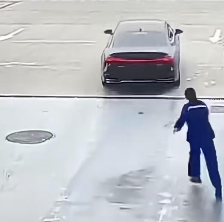 相关视频显示,一辆黑色奥迪车在加油站加油后离开,一名身着蓝色工作服的女子在后面追跑。