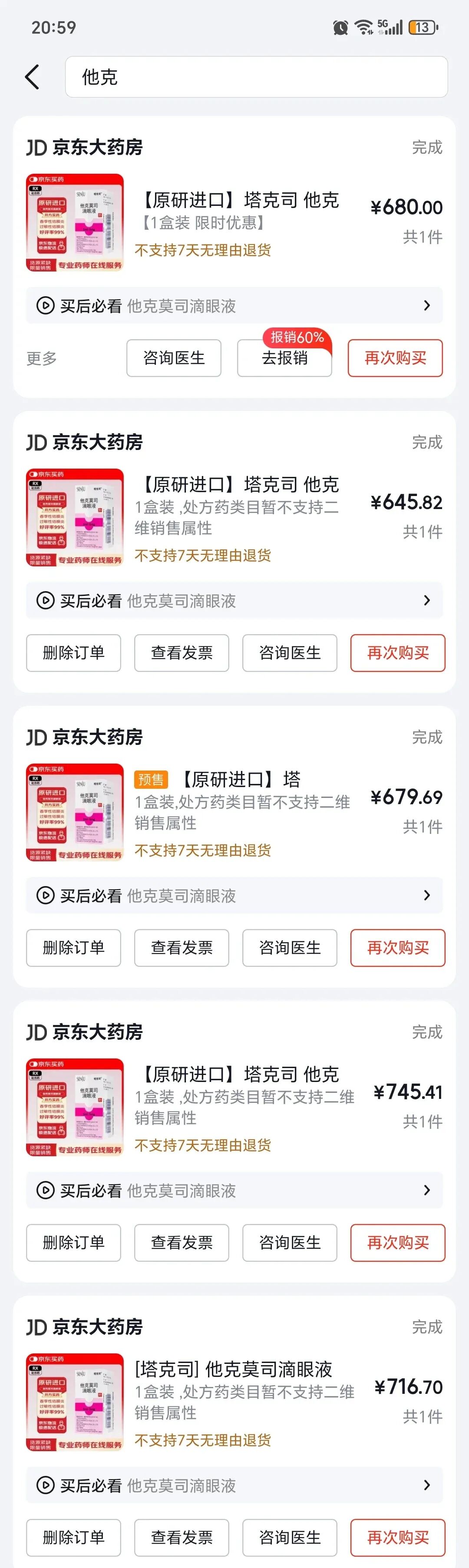 涂英近一年在电商平台购买他克莫司滴眼液的记录。图/受访者提供