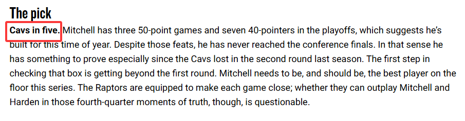 对于这一轮系列赛,NBA官网预测骑士4-1淘汰猛龙,米切尔曾在季后赛3次单场50+和7次单场40+,不过米切尔从未带队晋级分区决赛,米切尔需要在这轮系列赛中成为场上最好的球员,他和哈登冲冠的第一步就是闯过首轮。