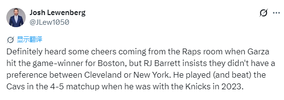 猛龙跟队记者Josh Lewenberg报道:当加尔扎投进关键球战胜魔术后,我听到了从猛龙更衣室传来的欢呼声,但RJ-巴雷特坚称他们对骑士和尼克斯之间没有偏好。