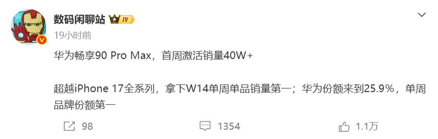 近日根据数码闲聊站所透露的最新数据显示,华为畅享 90 Pro Max手机首周激活销量超过 40 万,同时还超越 iPhone 17 全系列,拿下 W14 单周单品销量第一,另外得益于畅享系列新机的热销,华为份额来到 25.9%,拿下了单周品牌份额第一。
