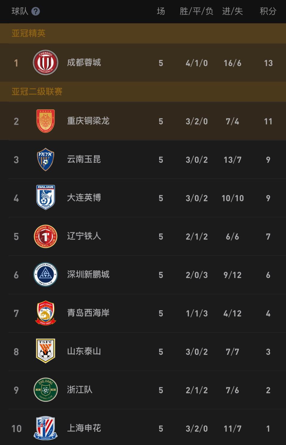 而重庆铜梁龙则在主场2-1力挫武汉三镇。两队5轮后继续不败,而蓉城4胜1平积13分,依然以2分优势继续力压铜梁龙,领跑积分榜。