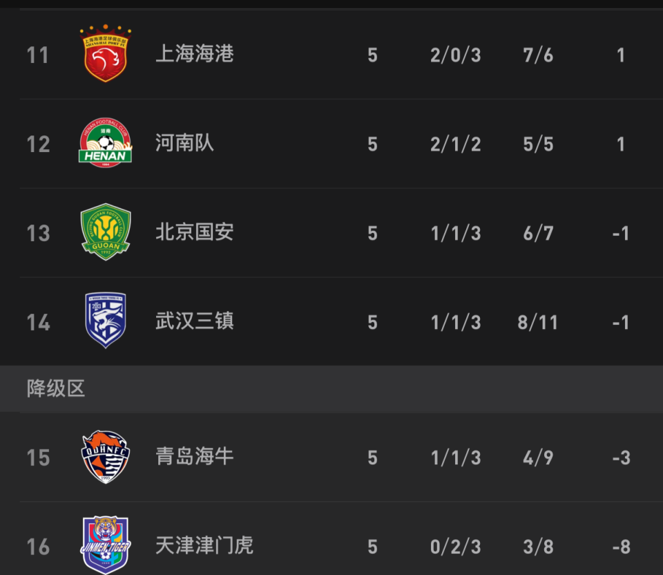 除了津门虎之外,还有3队5轮过后积分仍为负数。国安本轮被蓉城逆转后,积分仍为-1分,而三镇和海牛则分别是-1分和-3分。