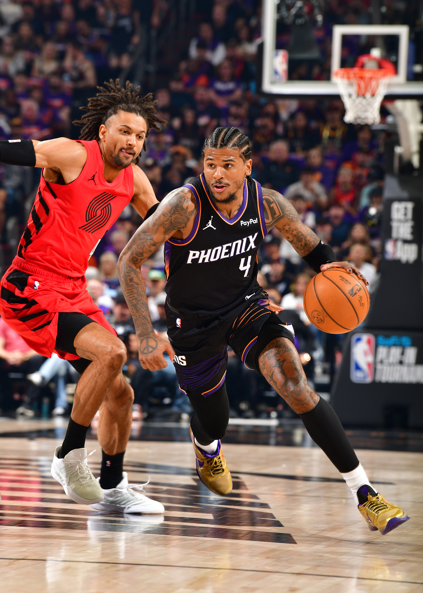 NBA附加赛西部第七的太阳大战西部第八的开拓者,太阳8-2开场领先,卡马拉轰进三分,布克造犯规罚球得分,面对开拓者的追分,杰伦-格林和布克连续得分,第一节打完太阳33-31领先2分,布克首节6投4中拿到12分,杰伦-格林则是单节4中4轰下10分。