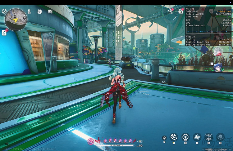 另一款原生游戏《鸣潮》我们也特意选择了NPC密度最高,地形建模最复杂的“星矩学院”场景进行测试。要知道它的手机版本在这个场景下,至今我们都没遇到能跑满60FPS的设备,但这台MacBook Pro已经能稳定在80FPS以上。