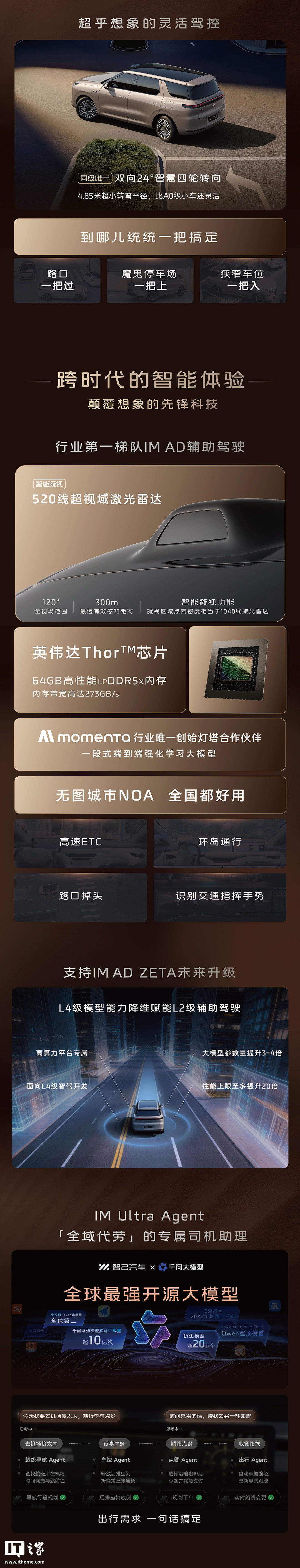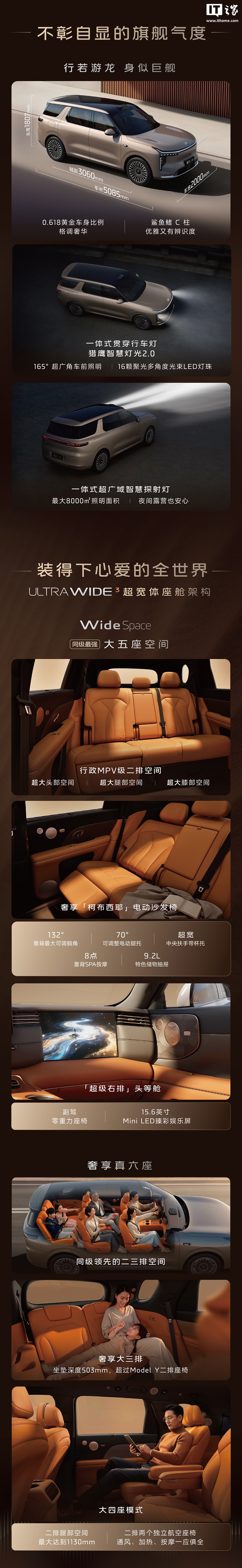 参考IT之家今日早些时候报道,智己LS8长宽高分别为5085/2000/1807mm,轴距3060mm。相较于LS9,新车在车长与轴距维度有所缩减,以形成产品层级区分。座椅布局提供5座与6座两种版本:5座车型第二排配备132度躺角沙发椅;6座车型第二排为两个独立座椅,支持机械按摩功能,并配备21.5英寸后排娱乐屏。