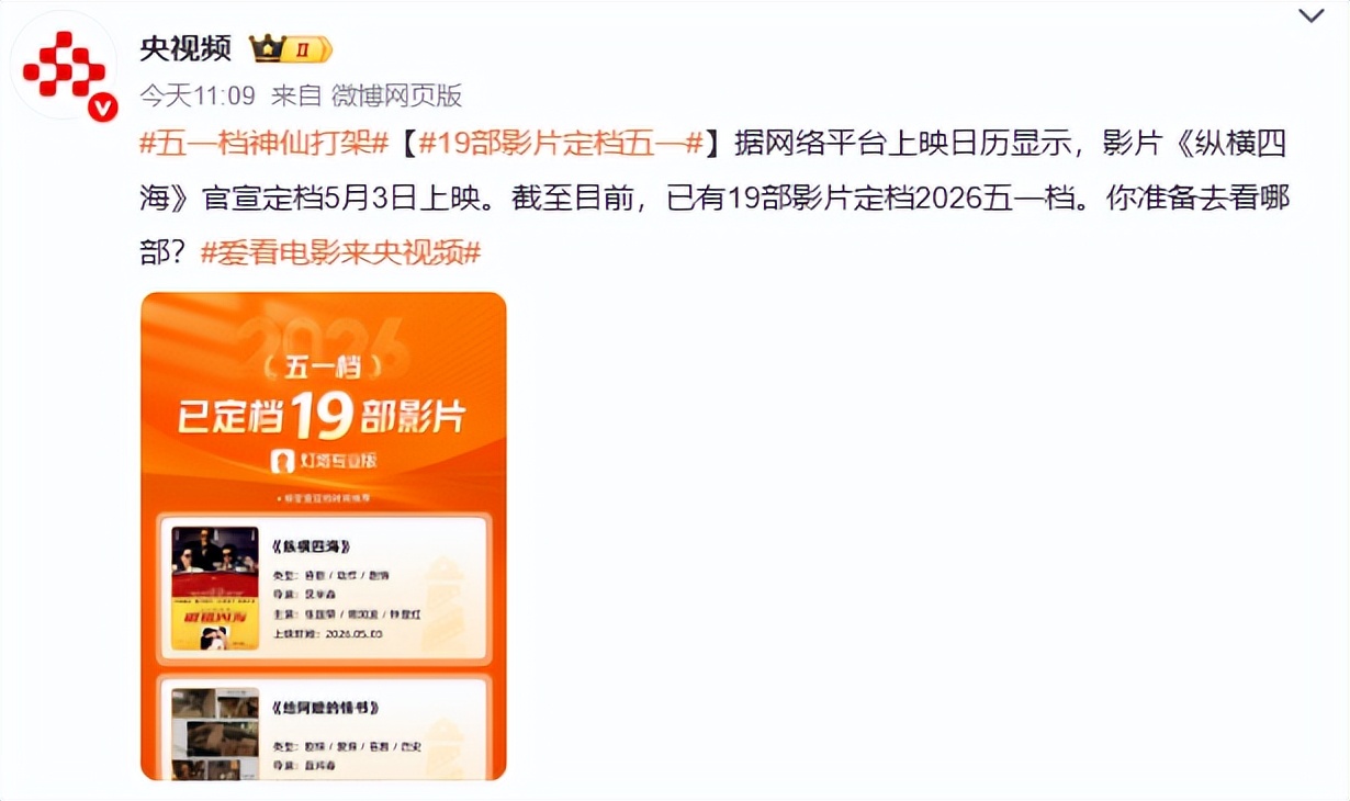 今年五一档已经有19部影片定档,就等着时机已到扎堆上映,数量显然创历史新高了。
