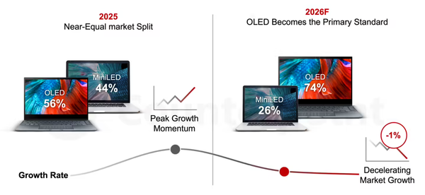 市场数据印证了OLED的全面崛起。CounterpointResearch报告显示,2025年全球笔记本电脑显示屏出货量同比增长7%,高端显示屏细分市场增幅达19%。展望2026年,高端显示屏市场内部急剧分化——MiniLED因成本压力与机型迭代调整,出货量预计大幅下跌43%,而OLED显示屏预计同比增长33%。OLED增长的核心动力来自苹果计划在下一代MacBookPro中采用TandemOLED技术,这一举措将加速OLED在IT设备中的渗透。