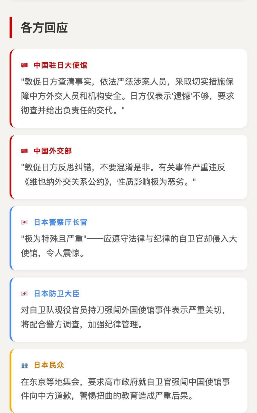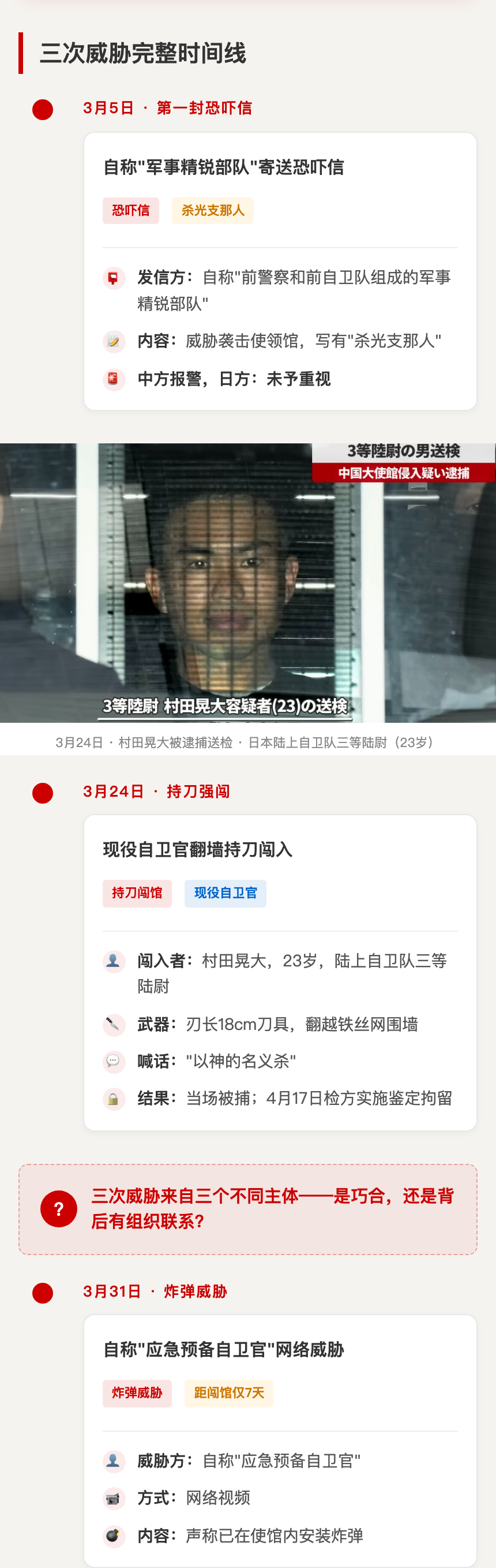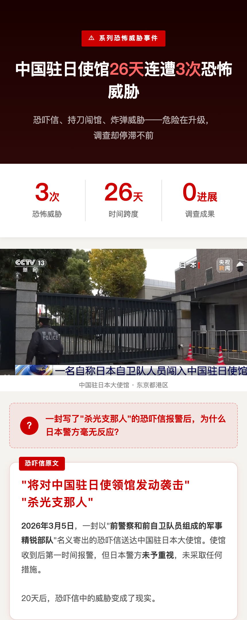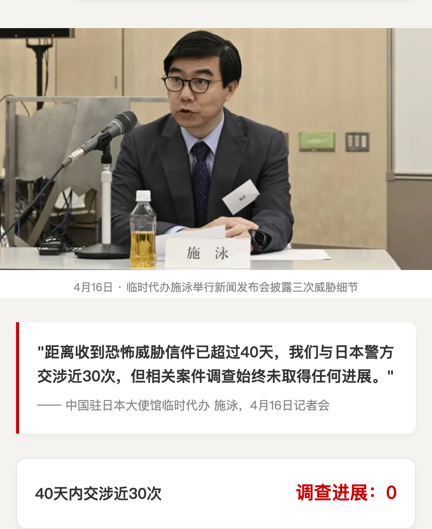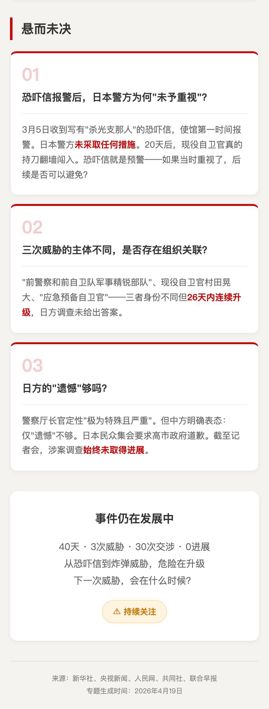 中国驻日使馆连遭恐怖威胁:持刀闯馆、炸弹恐吓,日本警方之前竟说"没大事" 作者: • 更新时间:2026-04-19 15:00 • 本文内容由互联网用户自发贡献,该文观点仅代表作者本人。如发现本站有涉嫌抄袭侵权/违法违规的内容,请发送邮件至 203304862@qq.com 本文链接:https://www.jinnalai.com/jiaodian/823420.html