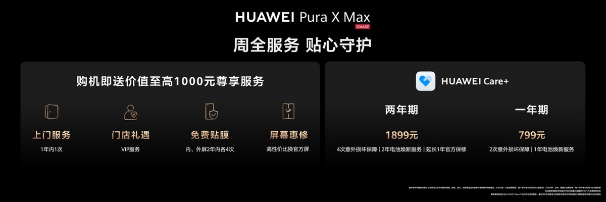 值得一提的是,华为还为Pura X Max用户准备了颇具诚意的尊享服务。现在购买华为 Pura X Max,可享内外屏 2 年内各 4 次免费贴膜,以及免费上门等专属服务。与此同时,HUAWEI Care+ 也迎来升级:两年期意外损坏保障由 2 次提升至 4 次,一年期则从原本的屏幕保障升级为 2 次整机意外保障。加购之后,裸机使用也能更加安心。