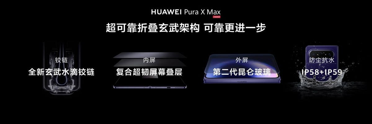 可靠性方面,华为Pura X Max搭载首创三重复合叠层结构设计,搭配UTG玻璃以及全新玄武水滴铰链,在频繁开合下依旧有出色的耐用性,能够适应更长使用周期需求。此外,还有第二代昆仑玻璃以及IP58/IP59级防尘抗水能力,不管是生活中的意外磕碰,还是雨天出行,都无需小心翼翼。