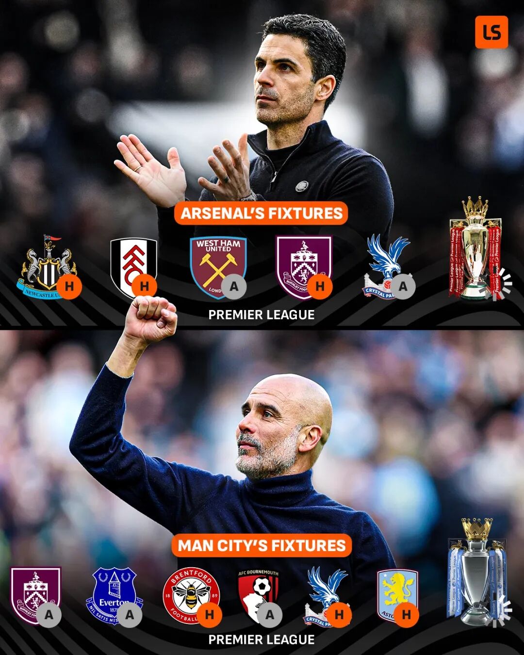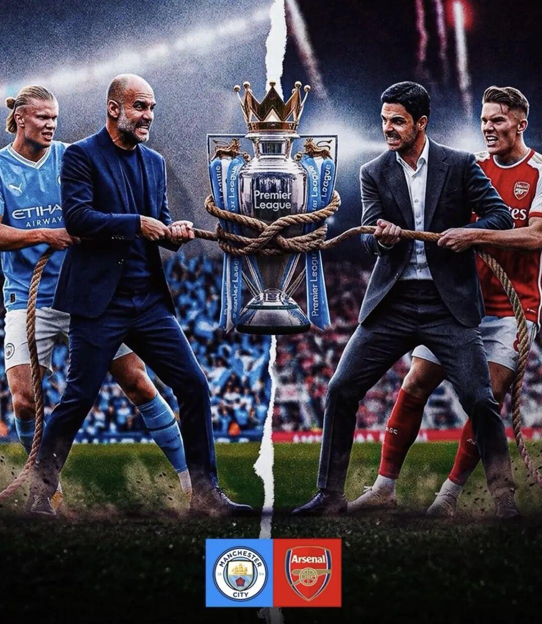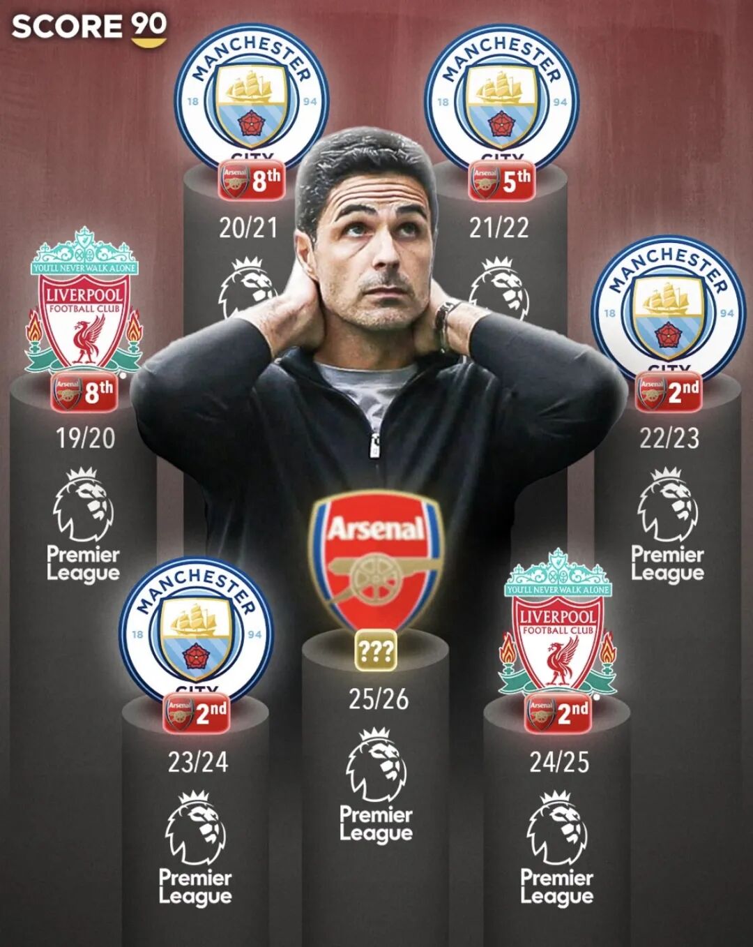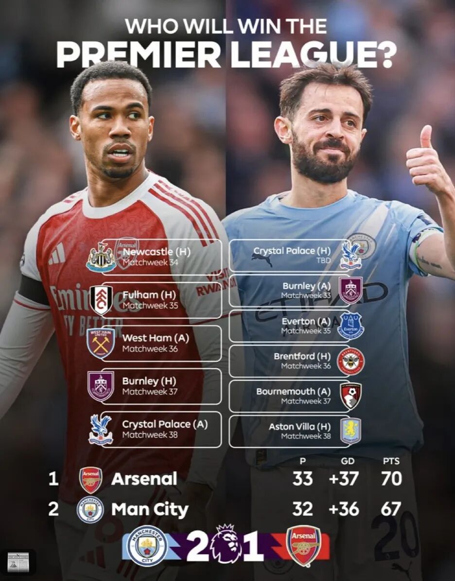 两队分别剩下5轮、6轮联赛,3分的分差,如果落后的曼城最终真的逆转夺冠,那么阿尔特塔的阿森纳,将会迎来英超四连亚。