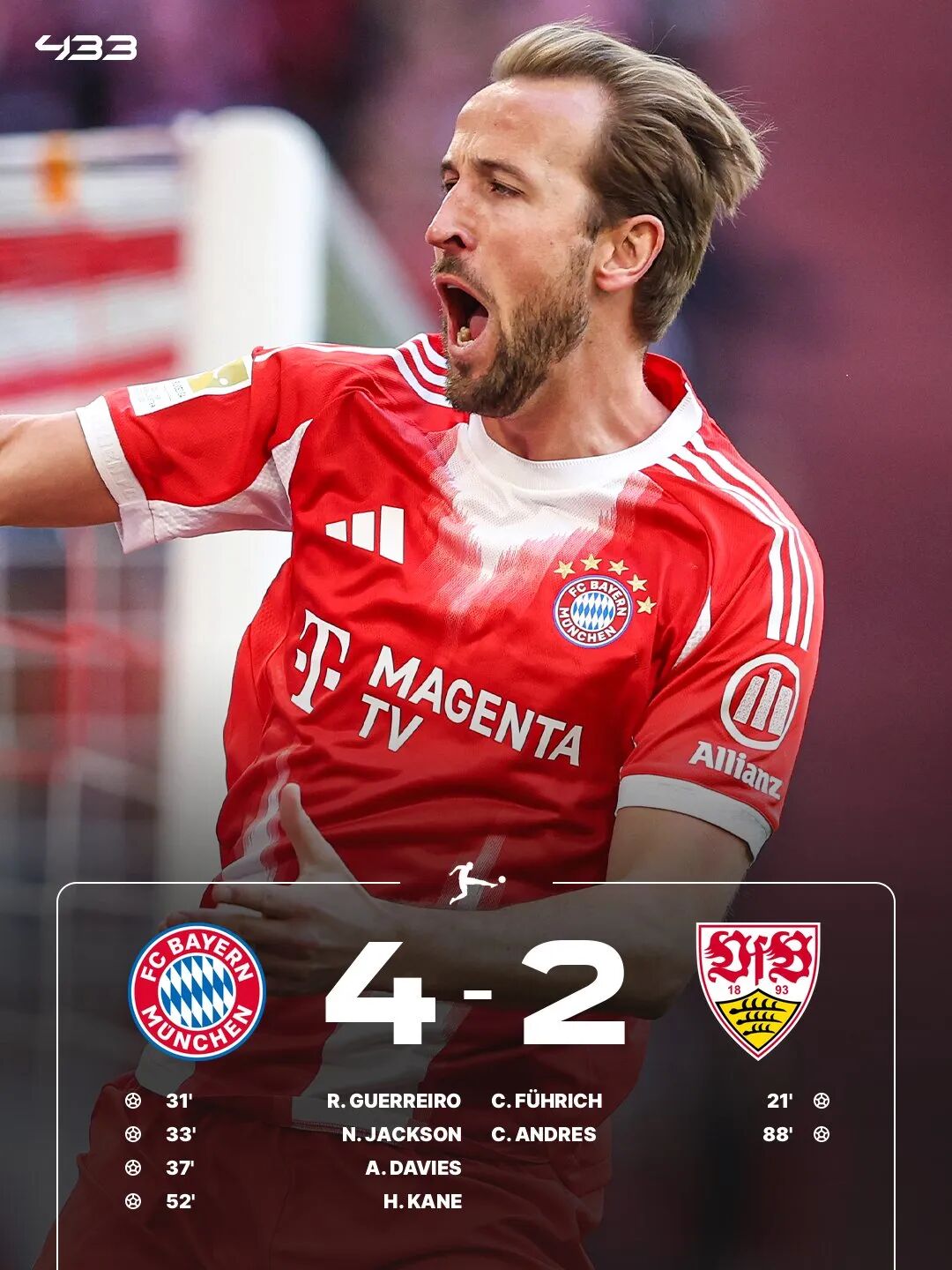 易边再战,替补出战的凯恩也取得进球,比赛尾声阶段,斯图加特凭借德烈斯轰出世界波扳回一球。