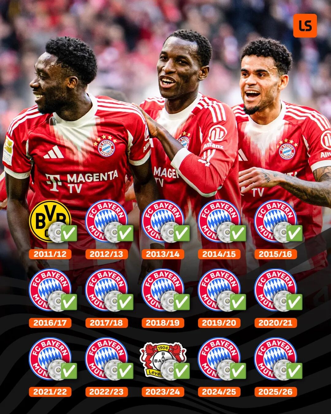 拜仁在德甲的统治力毋庸置疑,本赛季的联赛冠军,也是拜仁近13个赛季第12次夺得德甲冠军。