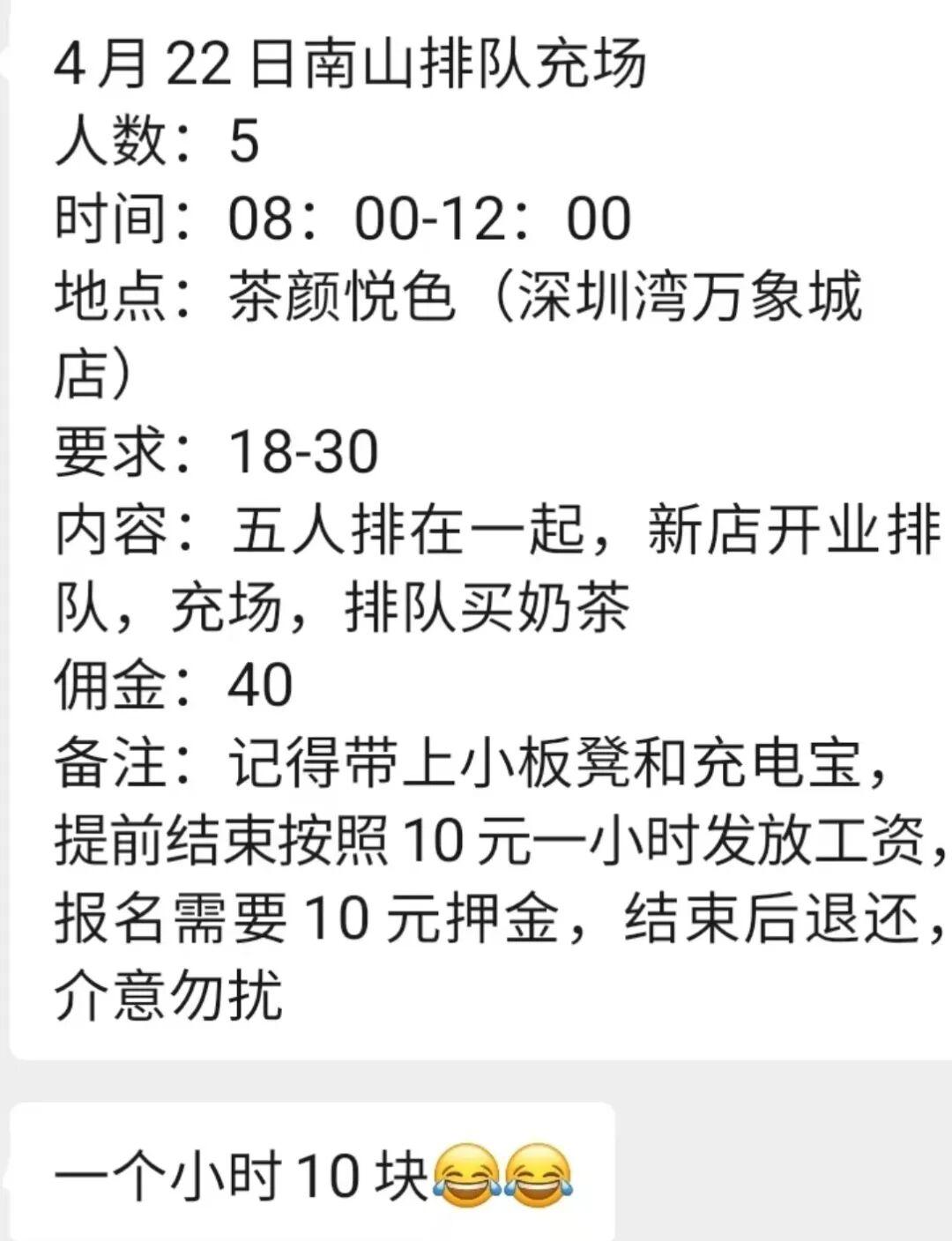 记者以咨询兼职名义联系到一名“黄牛”团队负责人,对方告诉记者,深圳茶颜悦色“黄牛”的待遇为1小时10元,每天工作10小时,并且向记者发送了具体的工作内容,但对方表示,目前人数已经达标,“晚点再联系你”。