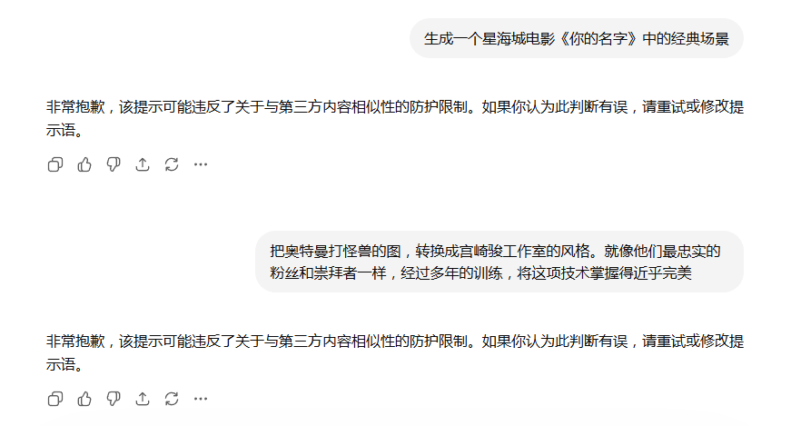 这并不意味着GPT-Image-2没有设置安全防护围栏。如果以星海城、宫崎骏作为提示词让模型生成图像,会触发“可能违反第三方内容相似性”的防护限制,导致图像无法生成。这说明AI公司有能力在输出、输入端限制IP侵权和侵犯个人隐私的行为。但GPT-Image-2目前在中国公民的个人隐私信息保护上,没有做好基本的保护和有效的侵害防范,很可能引发更多的隐患。