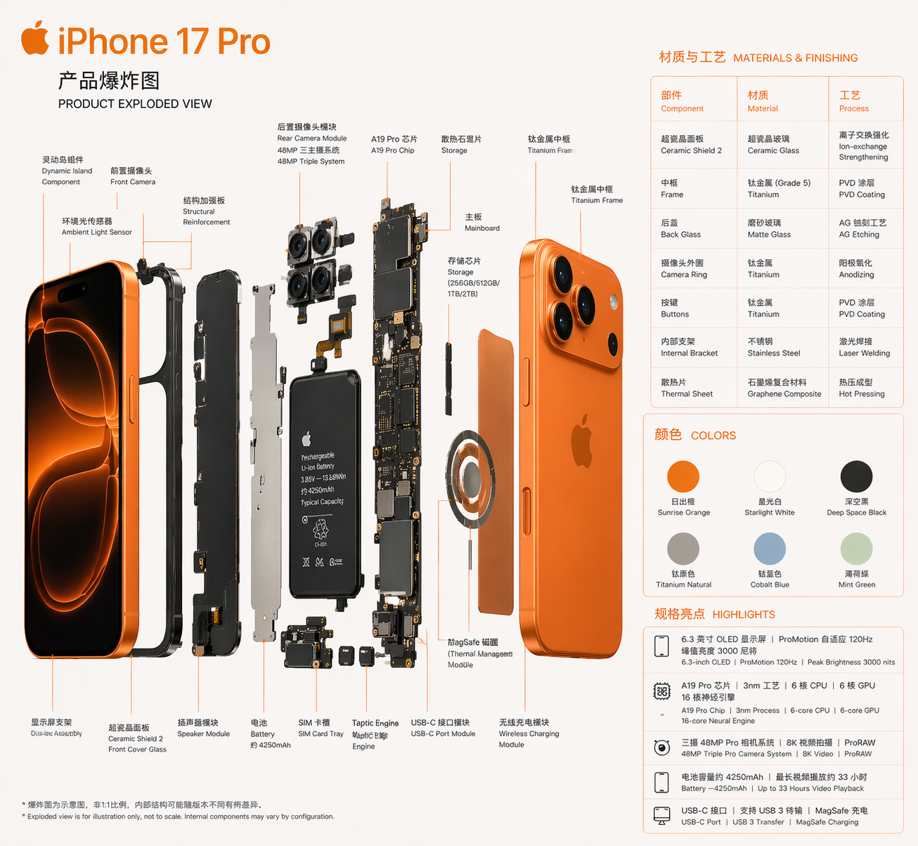 以iPhone17Pro为例,澎湃新闻对齐Lab仅用83个字的提示词(一张橙色iPhone17Pro的完整产品图,从屏幕到电池到主板,每个零件都有引线指向中英文标注(显示屏组件、芯片、电池等),旁边有材质与颜色表格)就一键生成了拆解IPhone的信息图。测试结果显示,它在文字、图片、可视化和排版等效果,已经到了真假难辩的阶段。
