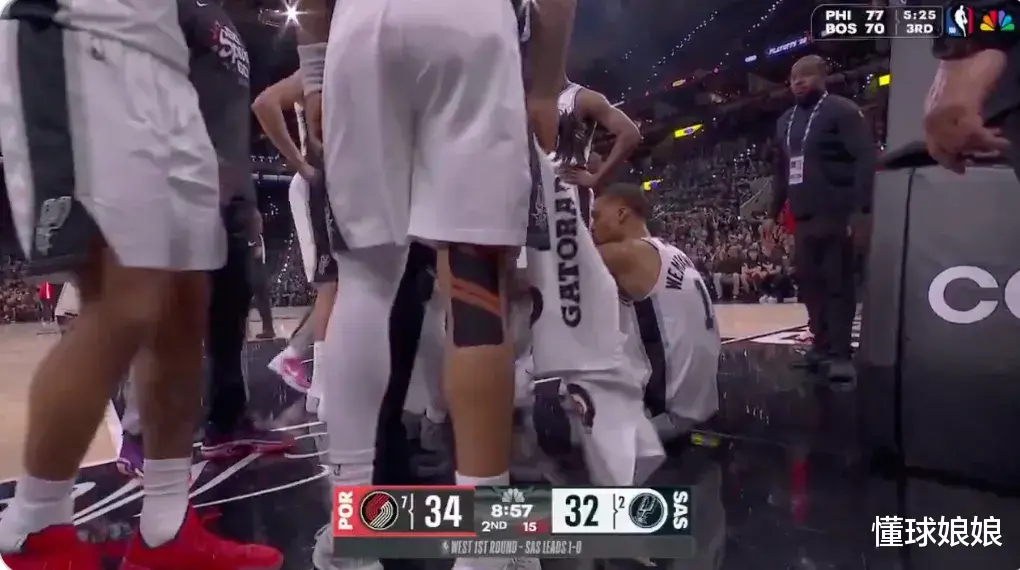 第二节刚开打没多久,文班在一次错位单打霍勒迪的时候摔倒,头部重重磕在地板上。