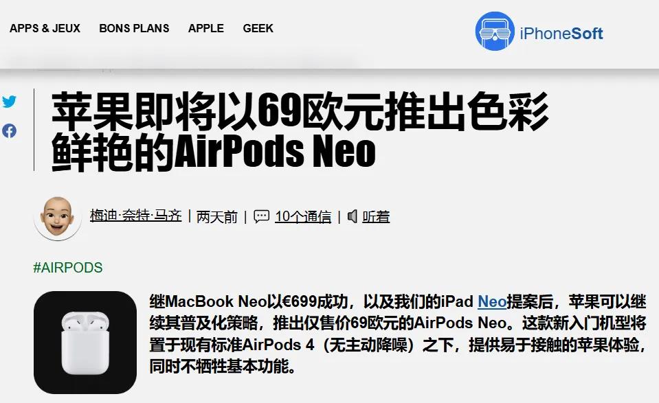 传闻苹果后续可能会推出Mac Neo,以缓解Mac mini库存短缺的压力;同时外媒iPhoneSoft爆料,苹果内部还在评估一款低价版耳机AirPods Neo。