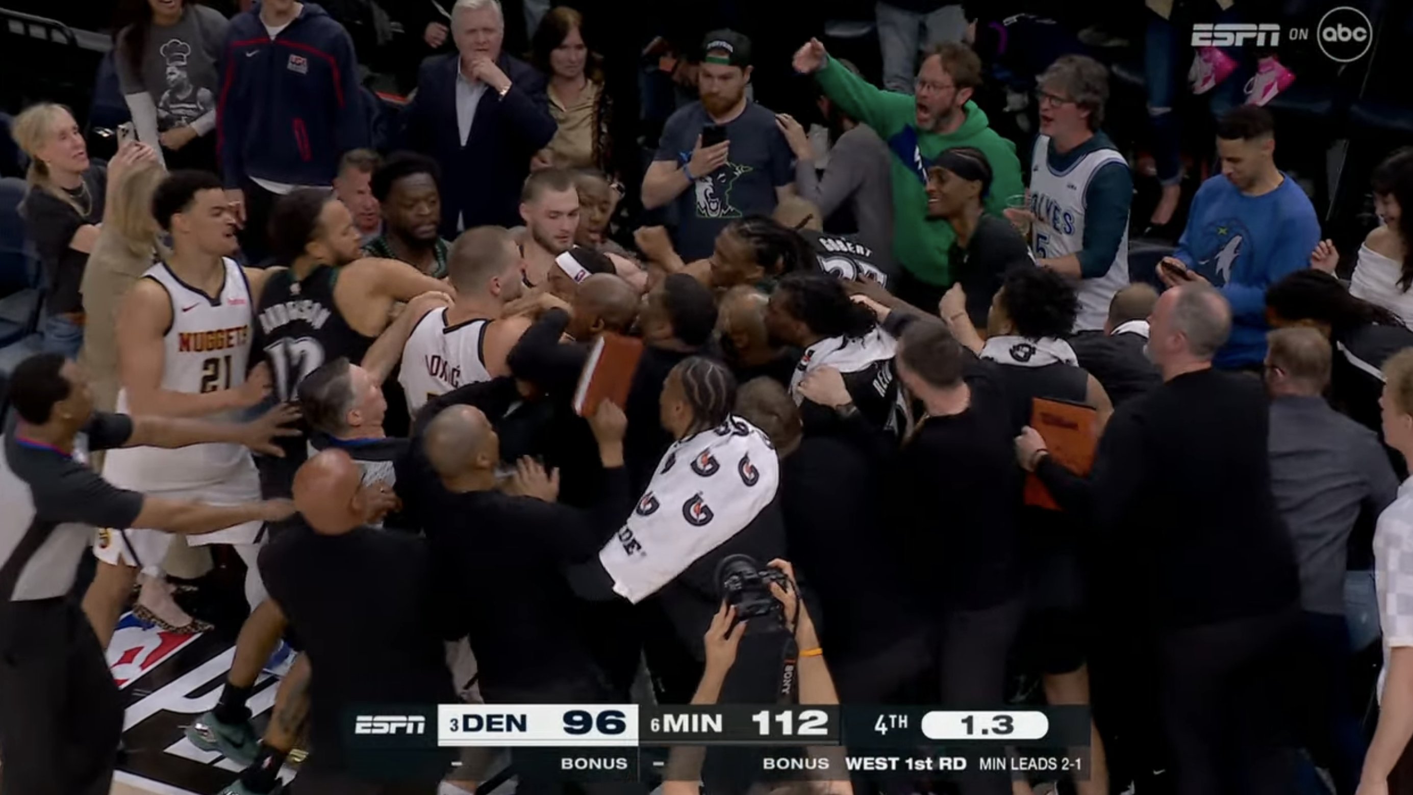 比赛还剩10秒森林狼110-96领先14分,穆雷三分打铁不中,康利拿到篮板并且拿球传给麦克丹尼尔斯,麦丹思考之后轻松上篮,对此约基奇十分生气,跑过去找麦丹理论,麦丹拽住约基奇的球衣,双方球员都围过来,兰德尔加入战斗,爆发大规模冲突,现场混乱不堪,最终约基奇和兰德尔都被驱逐离场。