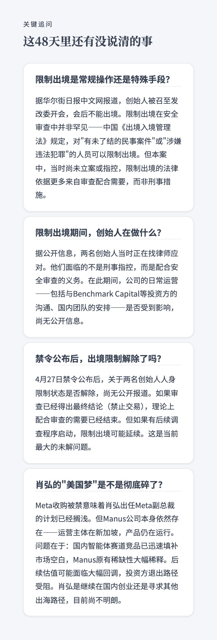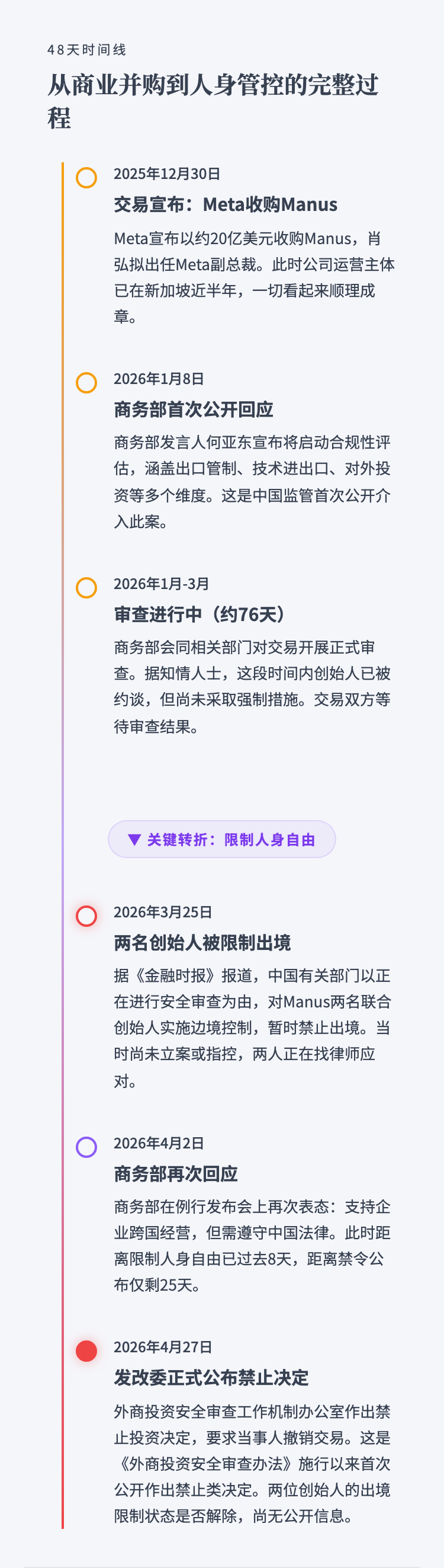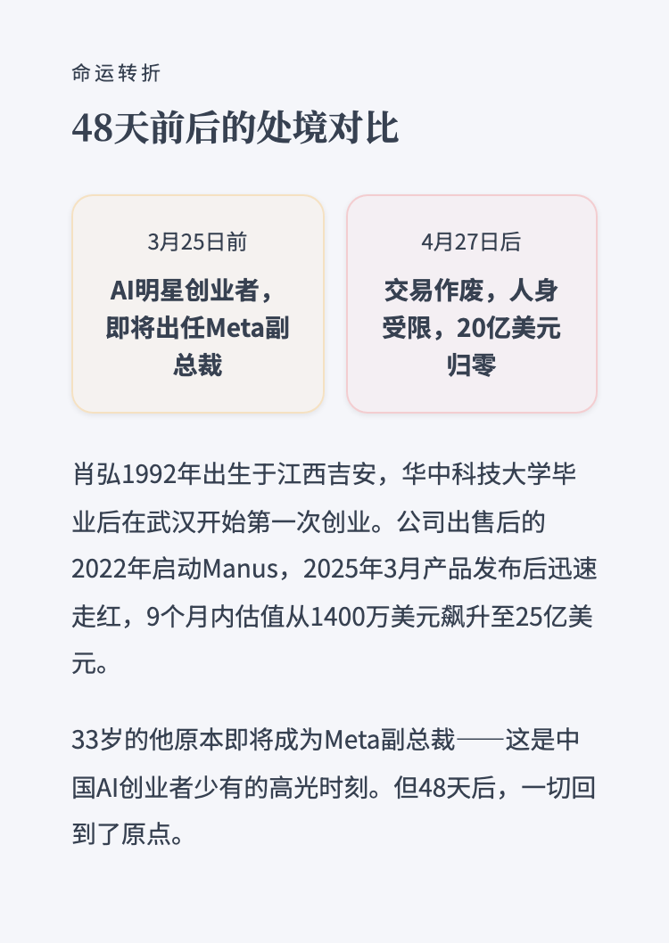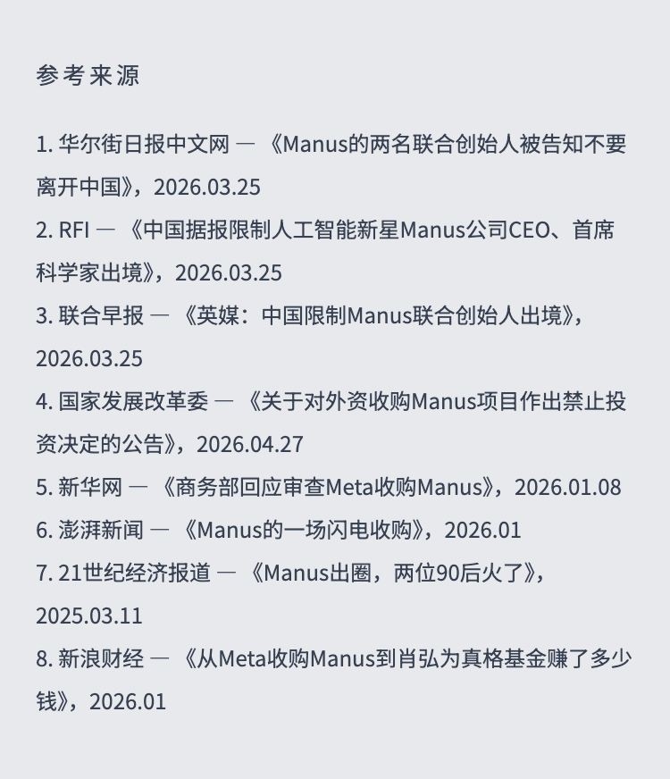 3月被限制出境4月交易被禁——Manus两位创始人的48天,商业并购如何变成人身管控 作者: • 更新时间:2026-04-29 13:30 • 本文内容由互联网用户自发贡献,该文观点仅代表作者本人。如发现本站有涉嫌抄袭侵权/违法违规的内容,请发送邮件至 203304862@qq.com 本文链接:https://www.jinnalai.com/jiaodian/825743.html